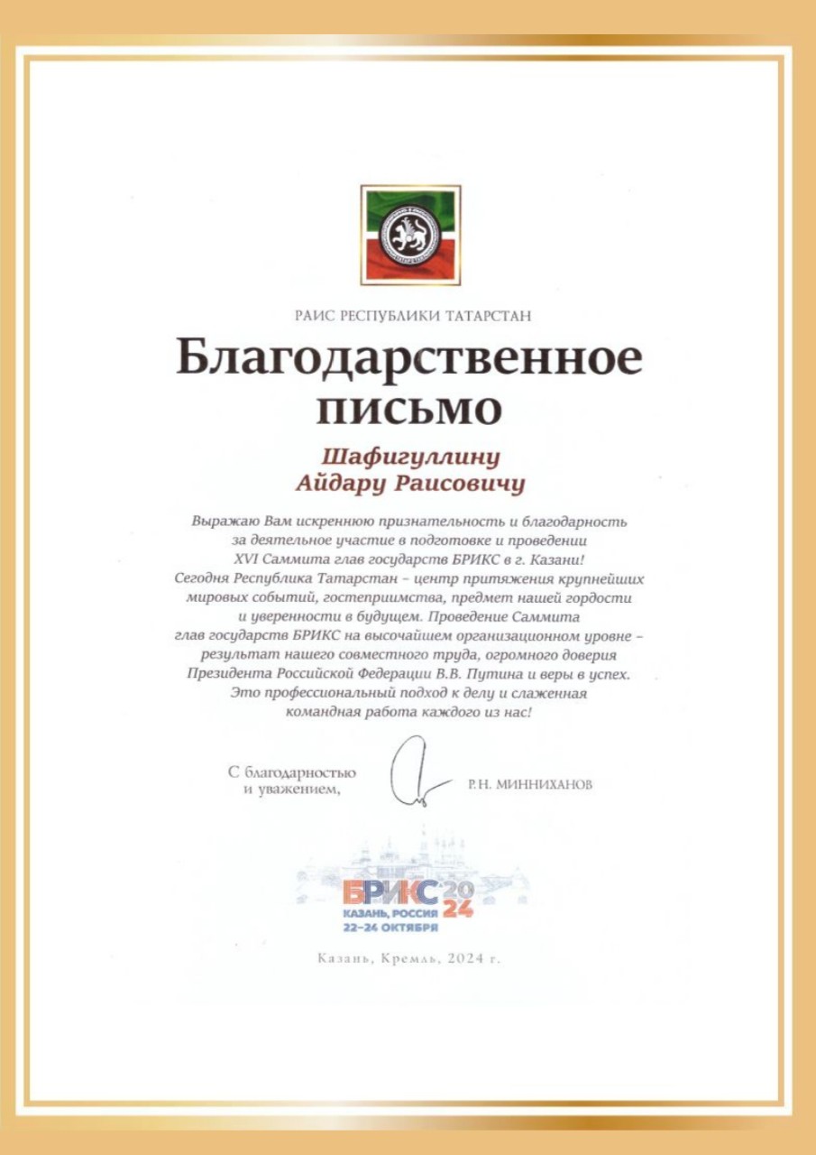 Благодарность за деятельное участие в подготовке и проведении XVI Саммита глав государств БРИКС в г.Казани