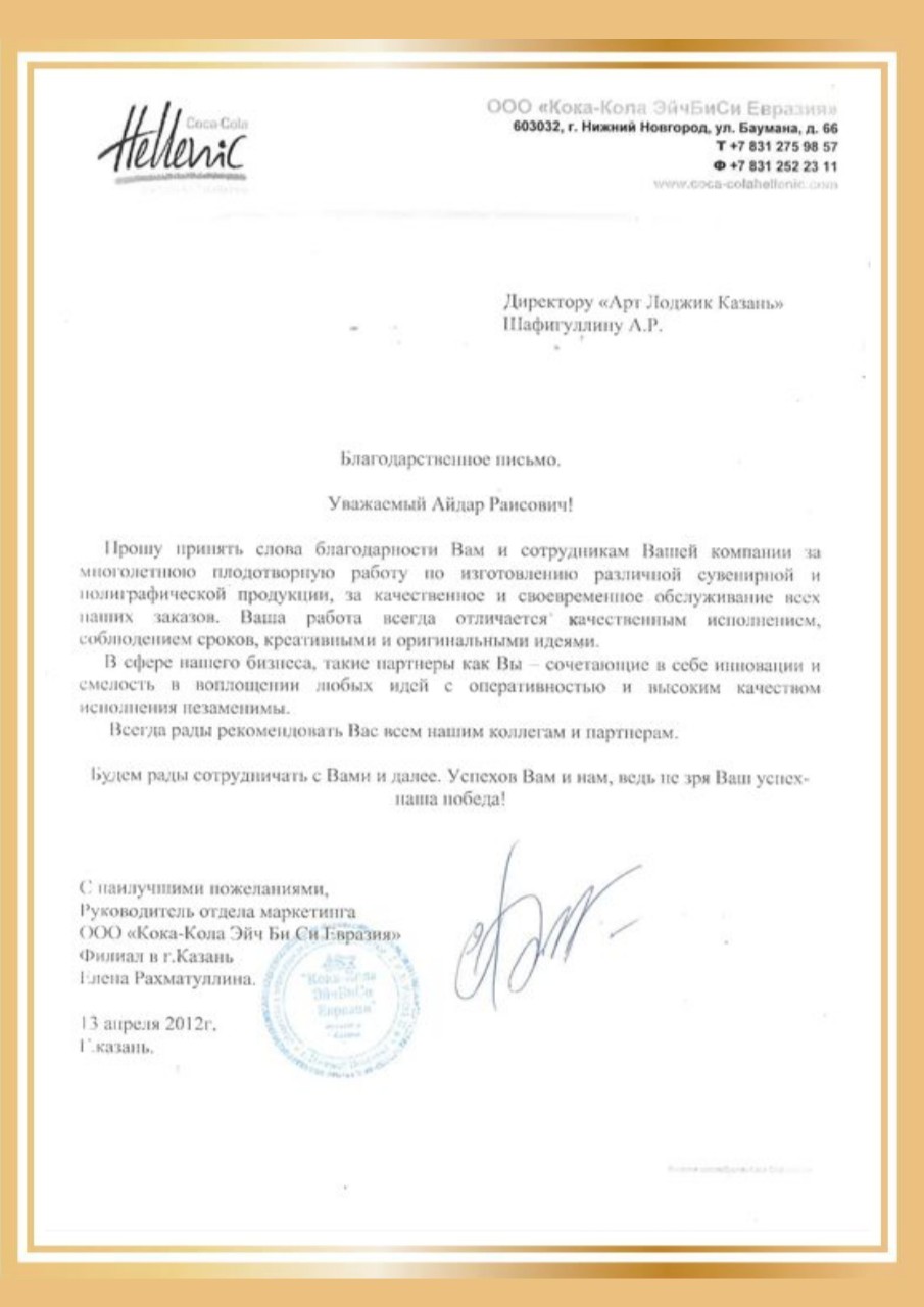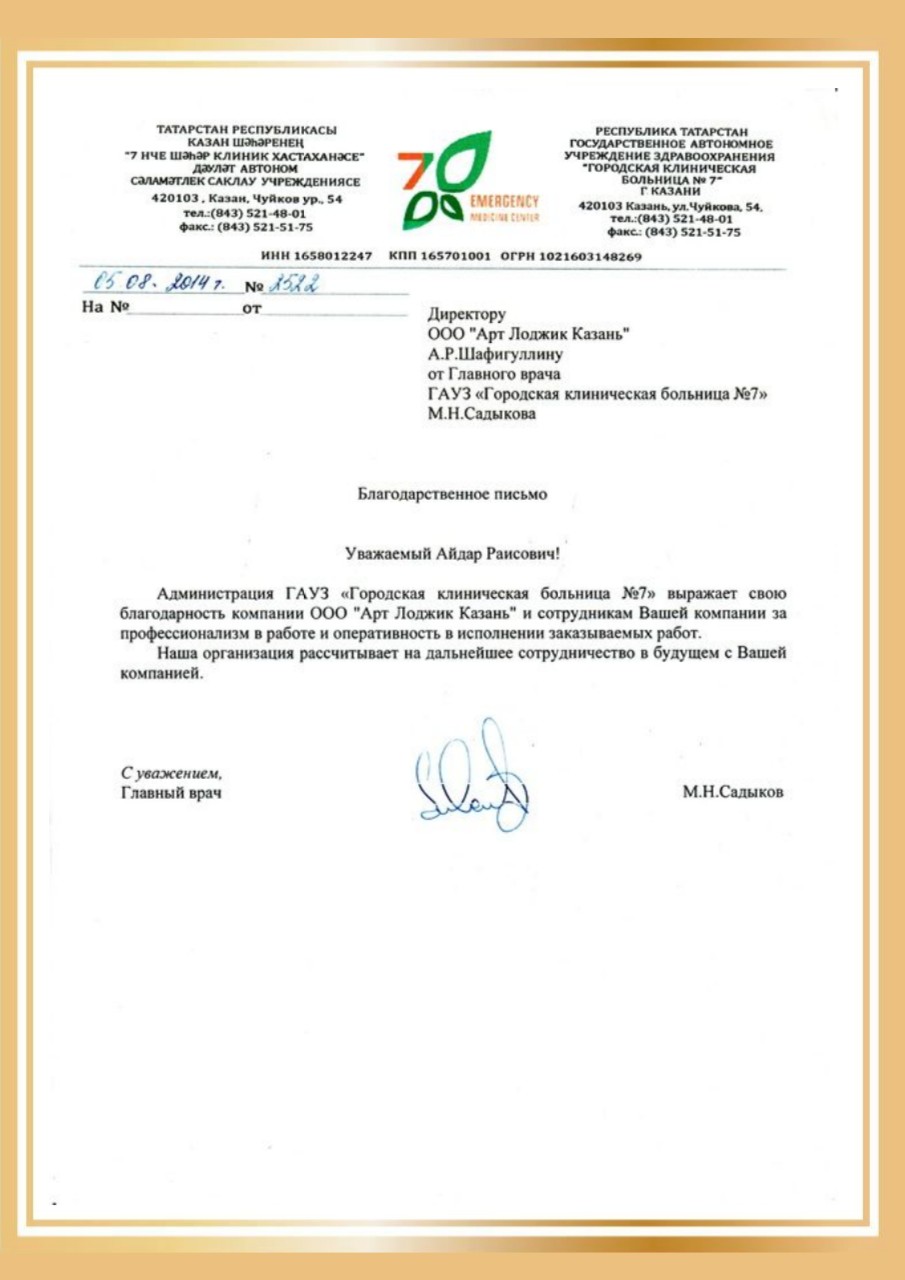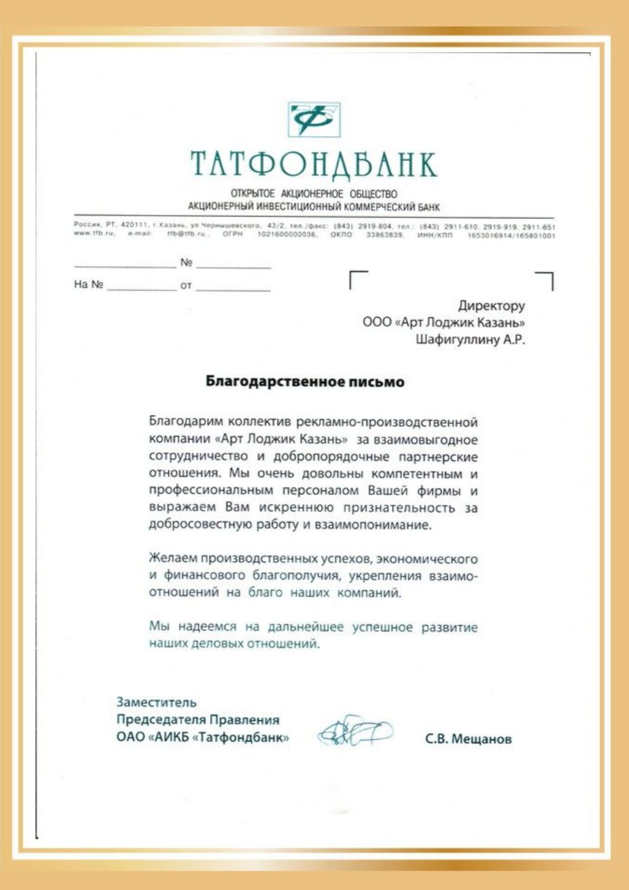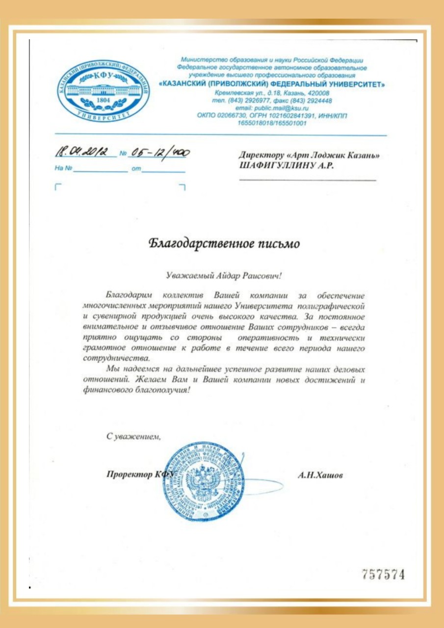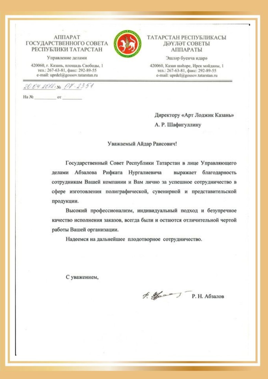 Благодарственное письмо от аппарата государственного совета Республики Татарстан