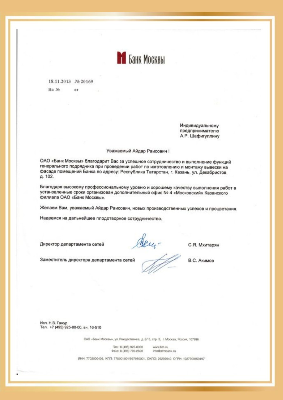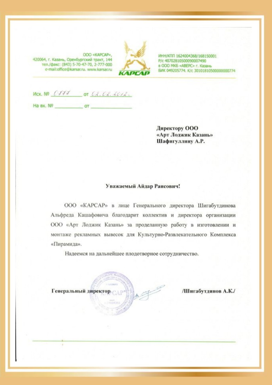 Благодарственное письмо от "Центра развития туризма Республики Татарстан"