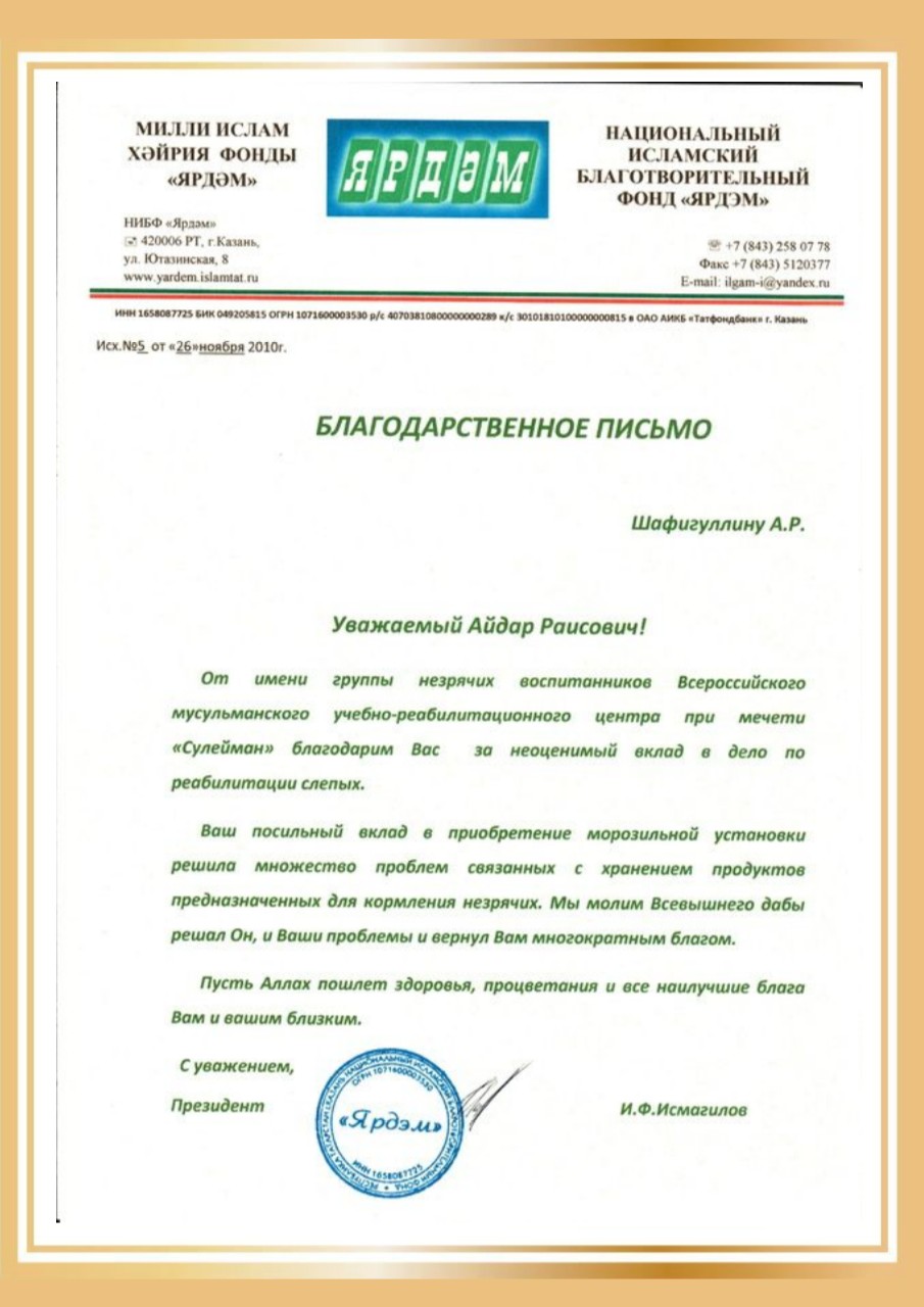 Благодарственное письмо Духовного Управления Мусульман Республики Татарстан